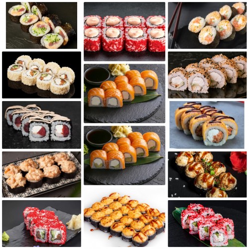 4250г (128 шматочків) Філадельфія, Філадельфія з авокадо, Чикаго, Балтимор, Сякі Які, Філадельфія в кунжуті, Каліфорнія з креветками, Канада, Вулкан, Токіо, Туна Спайсі, Каліфорнія Кані Спайсі, Каліфорнія, Запечені Теріякі (24шт - лосось теріякі, омлет томаго, сирний соус, сир гауда, унагі соус)