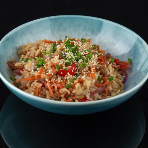 300 г. Рис, морква, болгарський перець, цибуля, томат черрі, кунжутна олія, кунжут, соус теріякі, цибуля зелена