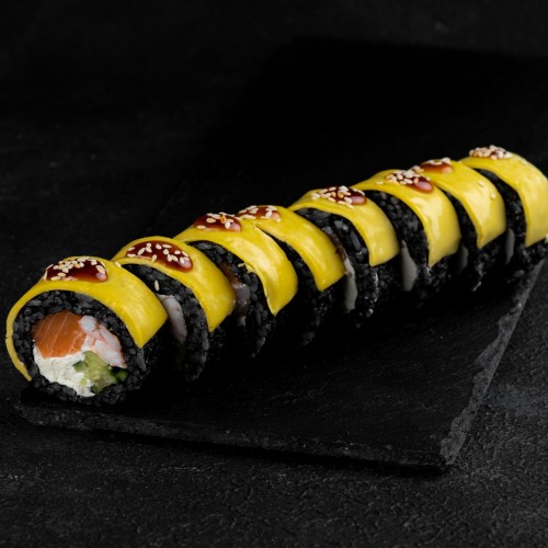 300г    Креветки тигрові, лосось, чеддер, крем-сир, огірок, кунжут, унагі соус, чорнила каракатиці