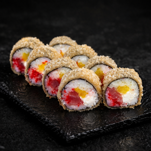 310г     Тунець, крем-сир, манго, ікра масаго, кляр, сухарі панко