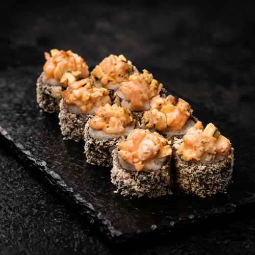 320г Креветки тигрові та куряче філе запечене в соусі спайсі , омлет томаго, авокадо, кляр, сухарі панко