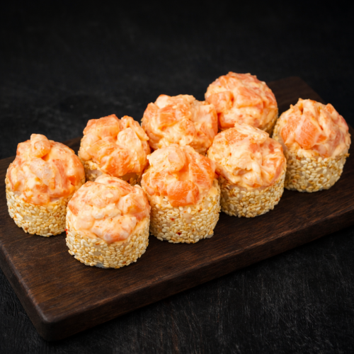 290г. Свіжий лосось, креветки тигрові, спайсі соус, огірок, крем-сир, кунжутДо ком..