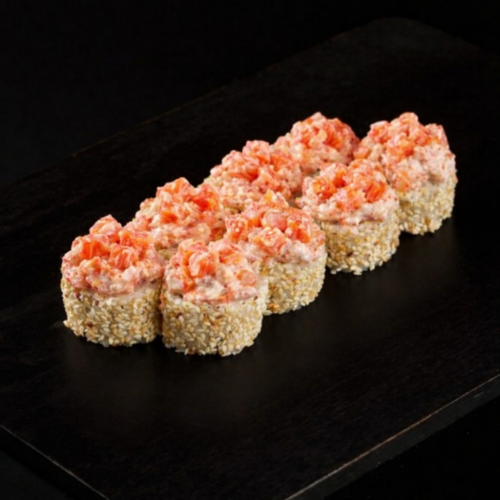 290г. Свіжий лосось, креветки тигрові, спайсі соус, огірок, крем-сир, кунжут