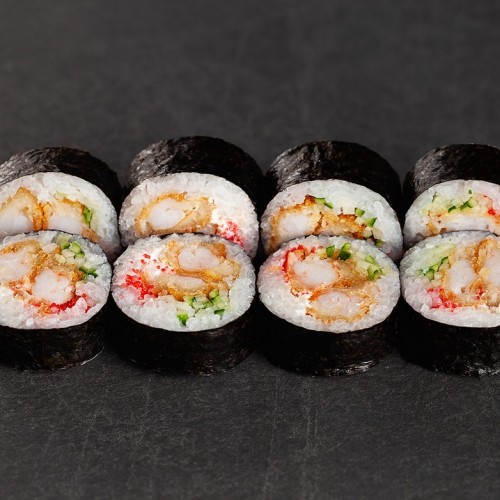 250 г Креветки темпура, ікра масаго, крем-сир, огірок