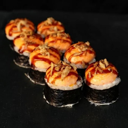 140г Креветки тигрові, спайсі соус, сир, унагі соус, цибуля фрі