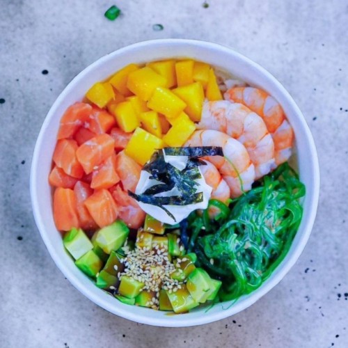 340 г.    Креветки тигрові, лосось, манго, авокадо, хіяші вакаме, крем-сир, норі, рис,  соус кисло-солодкий, кунжут