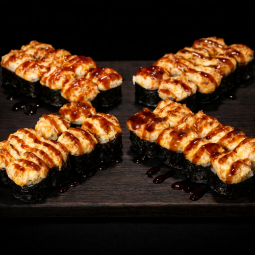 Обпалений рол 280г + 280г Гриль-лосось, крем-сир, огірок, спайсі соус, унагі ..