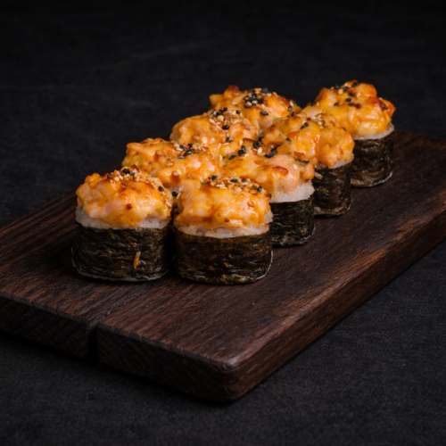 280г. Свіжий лосось, креветки тигрові, спайсі соус, огірок, крем-сир, кунжутДо ком..